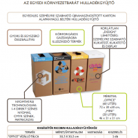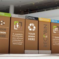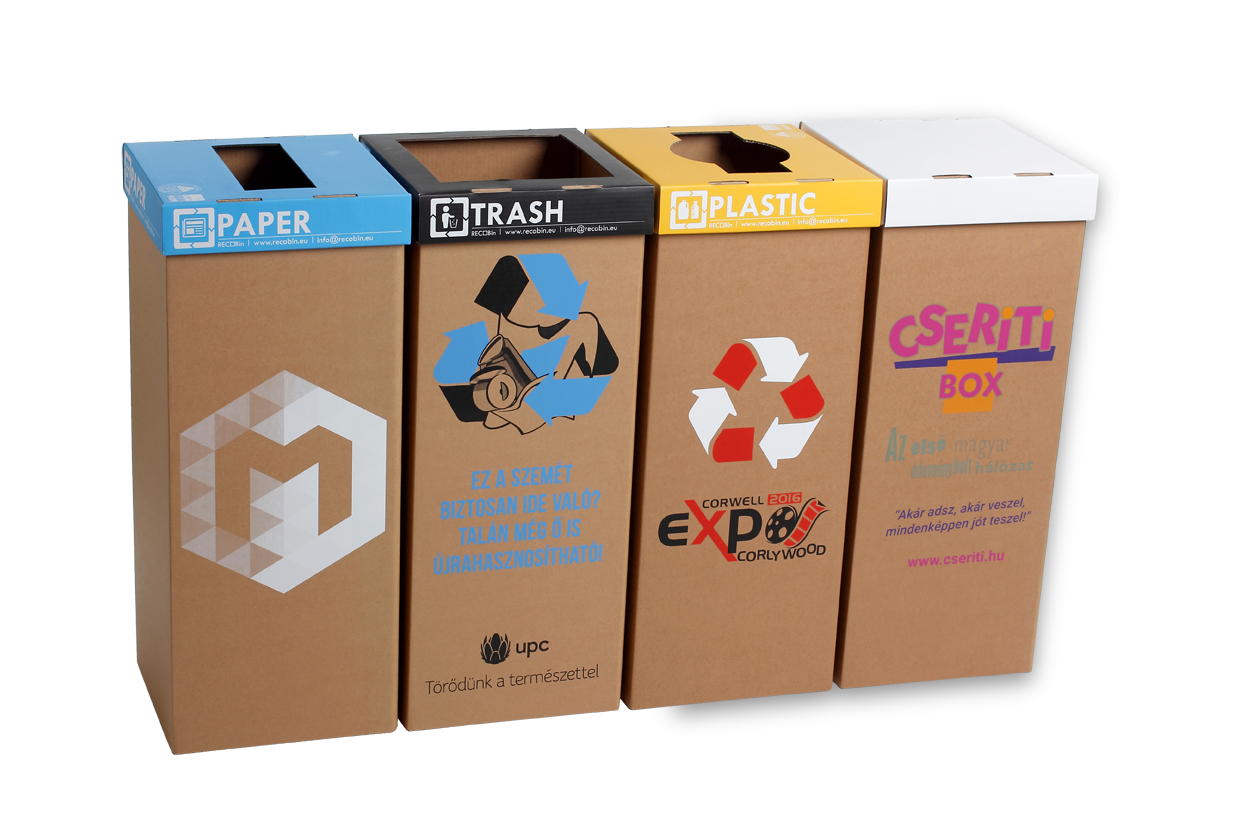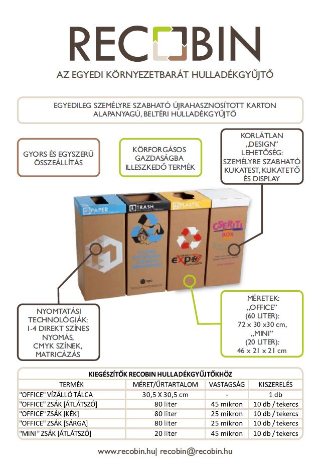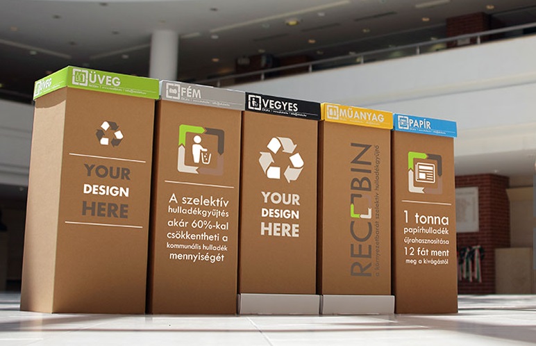 A Recobinnél egyedülálló módon lehetőség van a céges arculathoz illeszkedő, grafikával ellátott beltéri szelektív hulladékgyűjtő gyártására / rendelésére. Az egyedi kukák a hagyományos Recobin kukák tulajdonságai mellett, kíváló eszközként szolgálnak a belső és külső kommunikációra. A kukára céglogót, környezettudatosságot népszerűsítő üzenetet vagy bármilyen designt rakhat. Merítsen ötletet galériánkból, vagy álmodja meg egyedi kukáit saját elképzeléseid szerint!